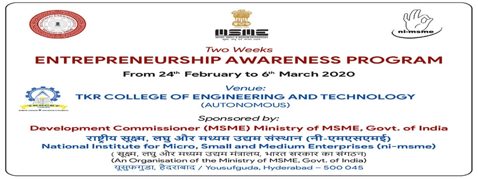KR College of Engineering and Technology (Autonomous) recognized as Host Institute for implementation of the scheme “Support for Entrepreneurial and Managerial Development of MSME’S through Incubate” by Ministry of Micro Medium and Small enterprises, Govt., of India invites proposals to incubate suitable Business ideas. Interested Entrepreneurs / Students / Others can apply through the following link http://msme.tkrcet.com/ on or before 13th January 2020 by 5 PM. The hard copy of the application should reach the Coordinator, Business Incubation Center (BIC), TKR College of Engineering and Technology, Medbowli, Meerpet, Balapur(M), Ranga Reddy (Dist), Telangana – 500097. For more information contact – 9666573666, 9908830209, 8498085216.